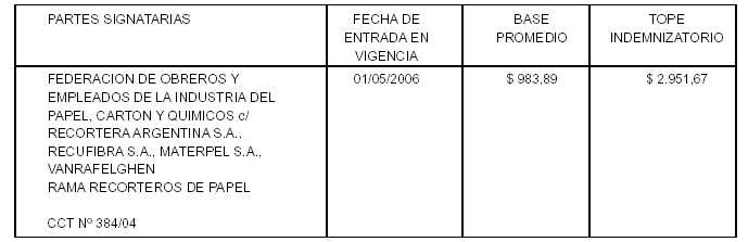 ARTICULO 1º — Fíjase el importe promedio de las remuneraciones y el tope indemnizatorio correspondiente al acuerdo salarial homologado por Resolución de la SECRETARIA DE TRABAJO Nº 433/ 06 y registrado bajo el Nº 444/06 suscripto entre la FEDERACION DE OBREROS Y EMPLEADOS DE LA INDUSTRIA DEL PAPEL, CARTON Y QUIMICOS y las empresas RECORTERA ARGENTINA SOCIEDAD ANONIMA, RECUFIBRA SOCIEDAD ANONIMA, MATERPEL SOCIEDAD ANONIMA, Oscar Ramón VANRAFELGHEN en su calidad de titular de la firma unipersonal del mismo nombre, conforme al detalle que, como ANEXO, forma parte integrante de la presente.
