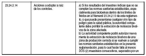 | Aptitud para consumo humano | 23.26.6 | La totalidad de los productos procesados en los CEM debe dar cumplimiento a lo establecido en los requisitos de higiene para la extracción y comercialización de moluscos bivalvos, según el Capítulo XXIII, numeral 23.24.4 de este reglamento. |
