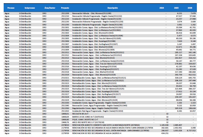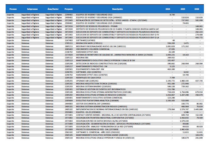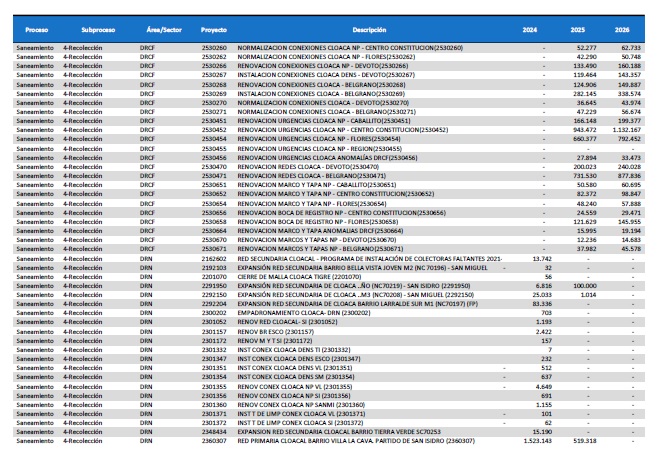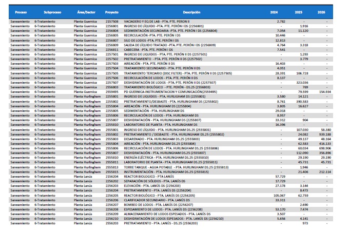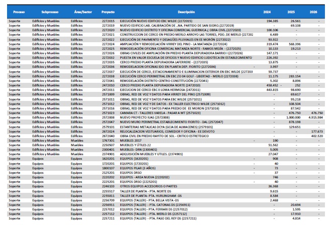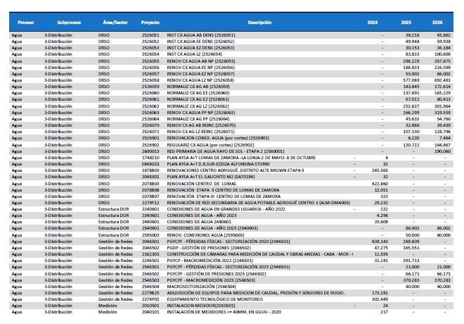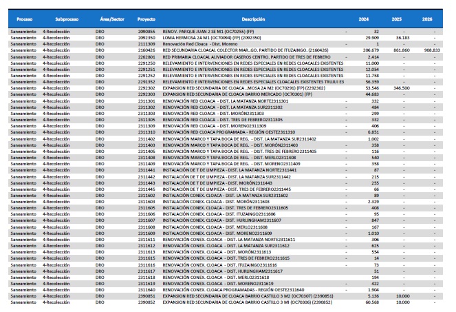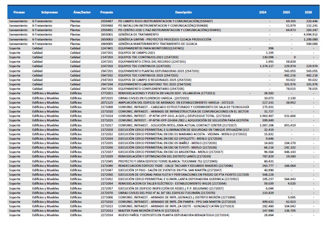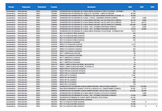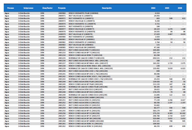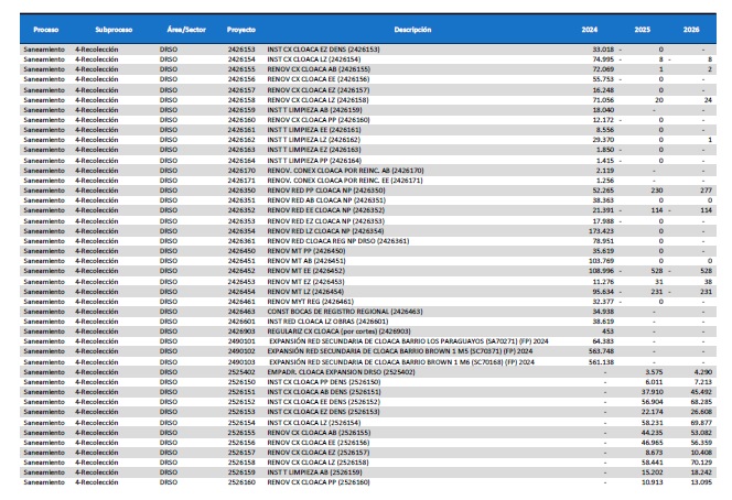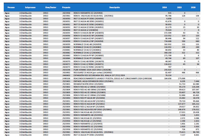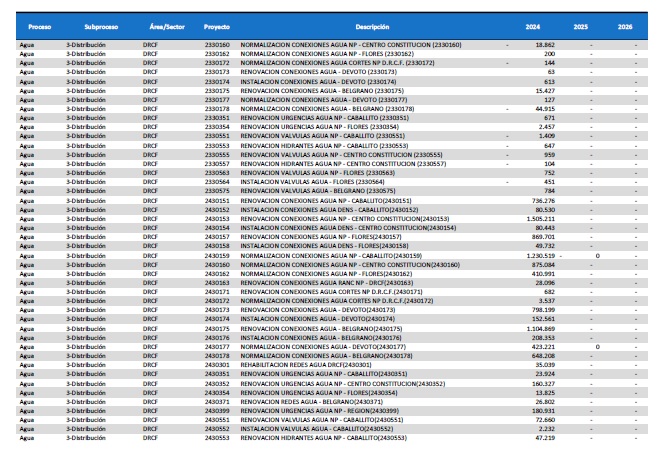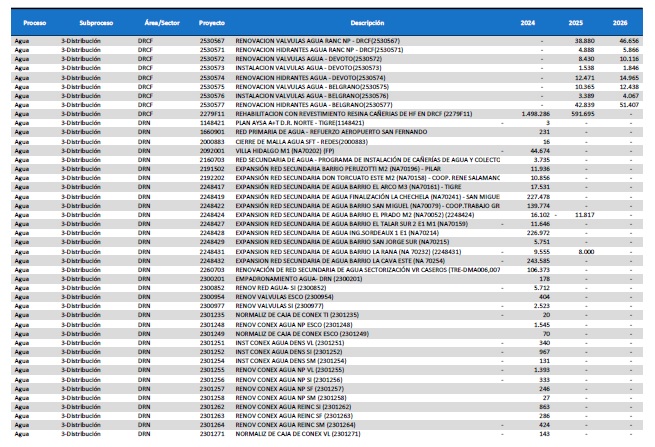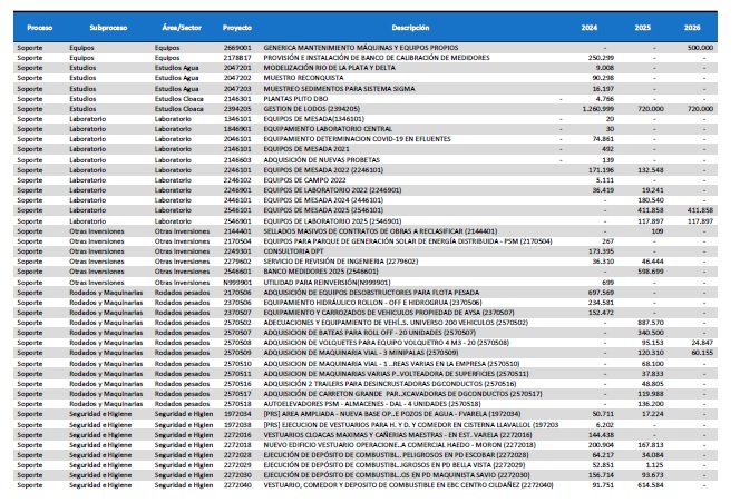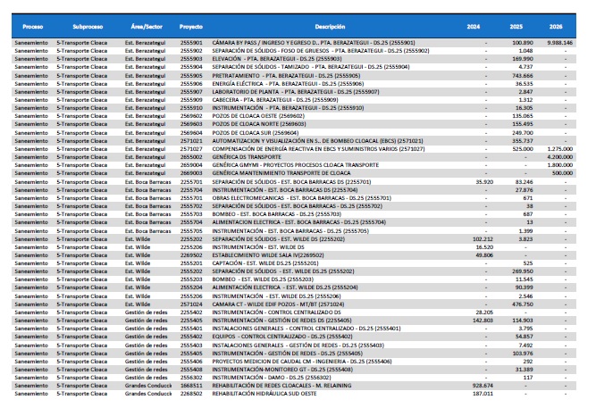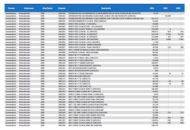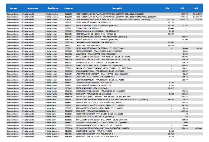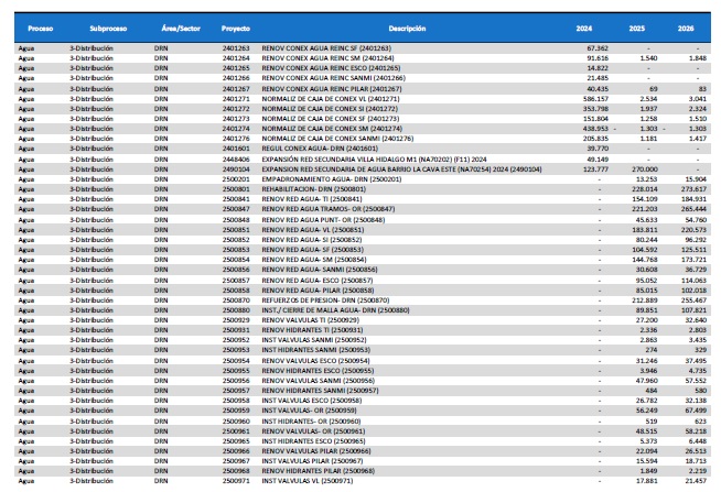 pormenorizado de proyectos de inversión de mejora y mantenimiento del