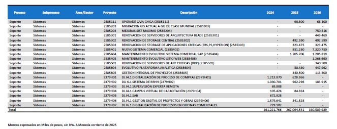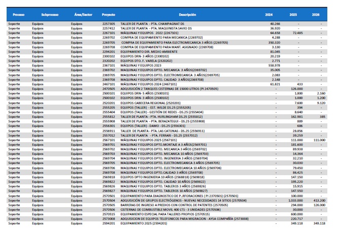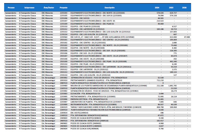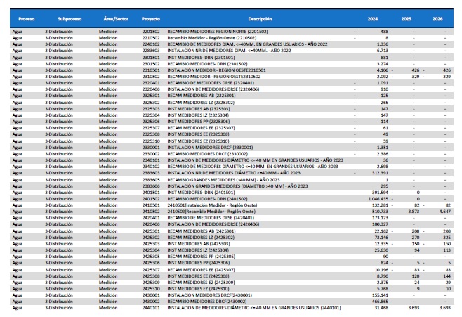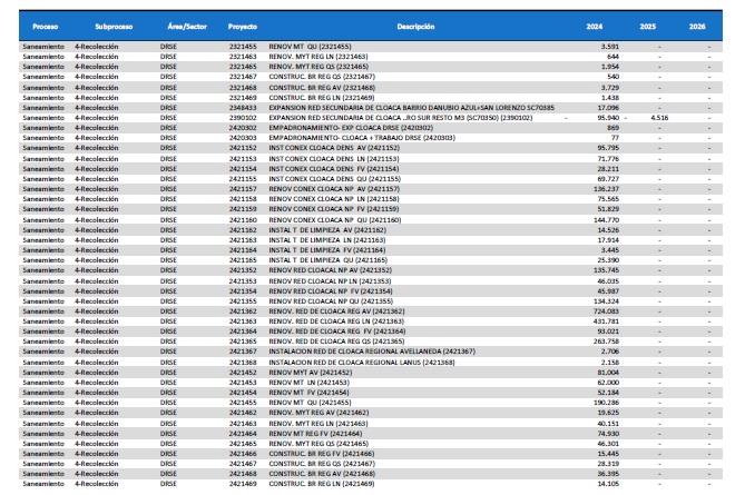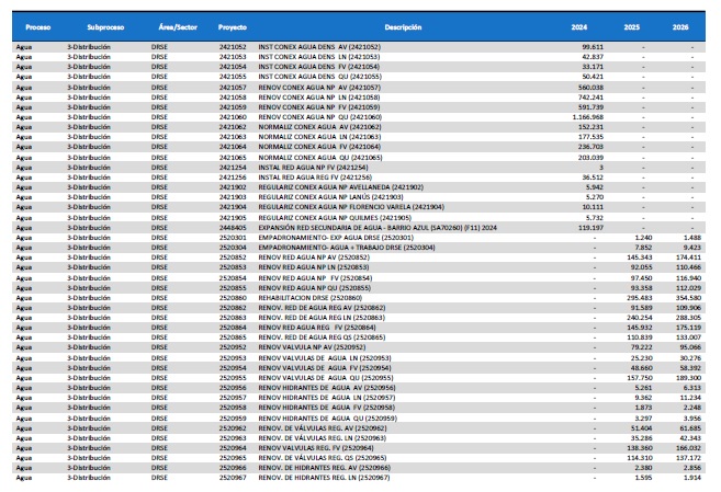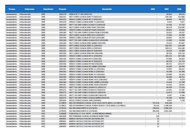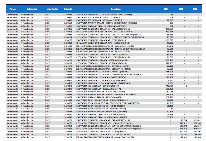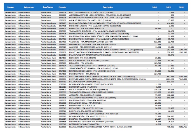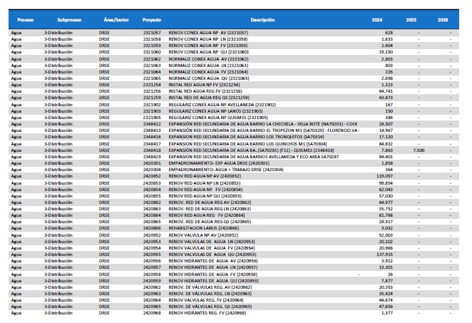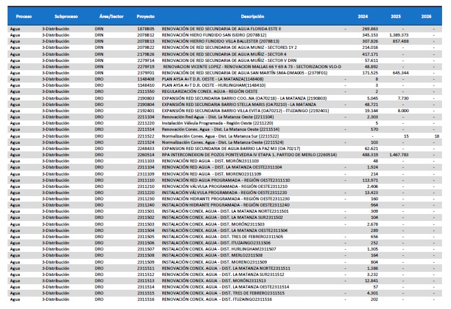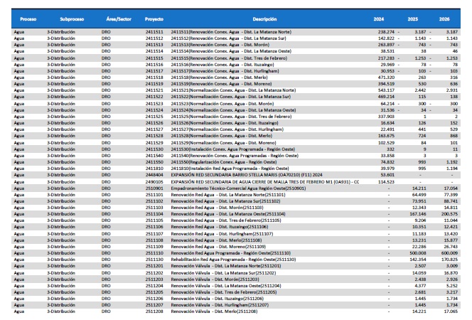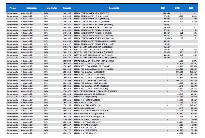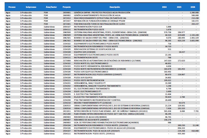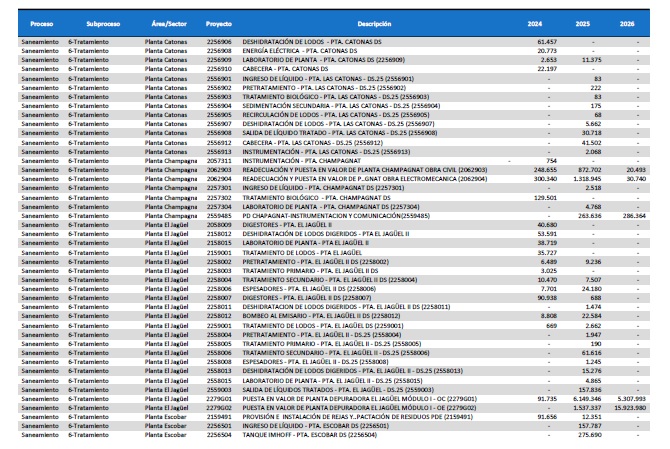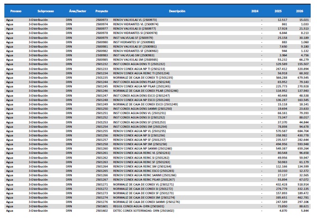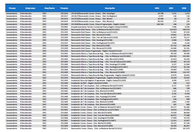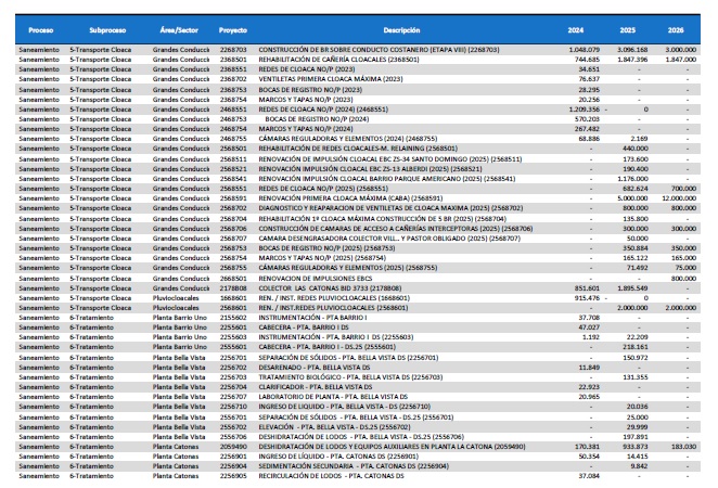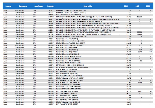 pormenorizado de proyectos de inversión de mejora y mantenimiento del