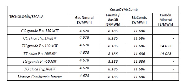 los costos variables no combustibles [CostoOYMxComb] indicados en la