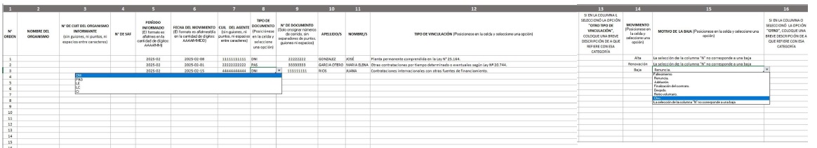Columna 8 - Tipo de Documento: Seleccionar el tipo de documento del agente desde el menú desplegable en cada celda.