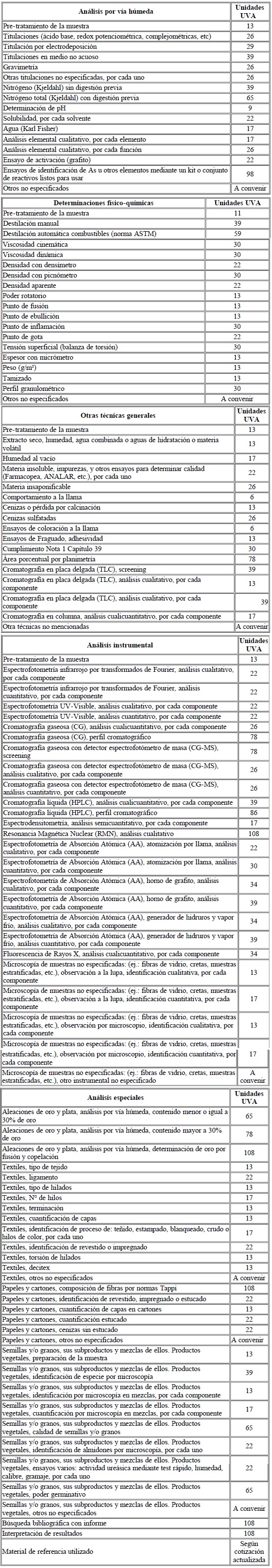determinaciones analíticas con sus aranceles, relativos a los servicios