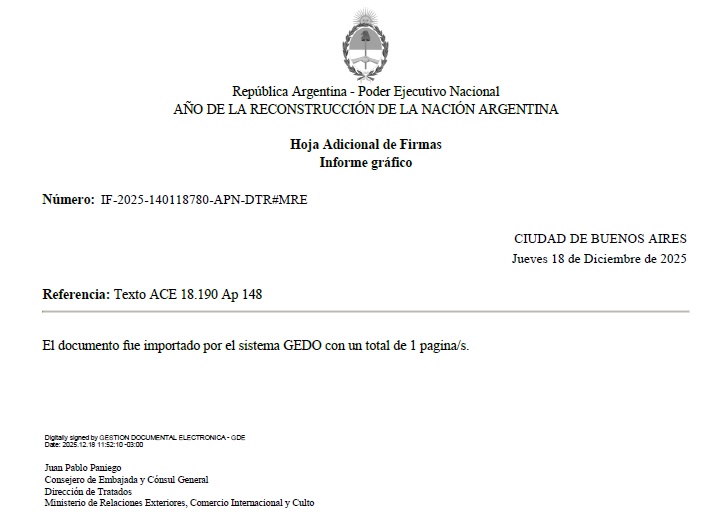 N° 18 (ACE N° 18), de acuerdo a lo dispuesto en el artículo 18 del