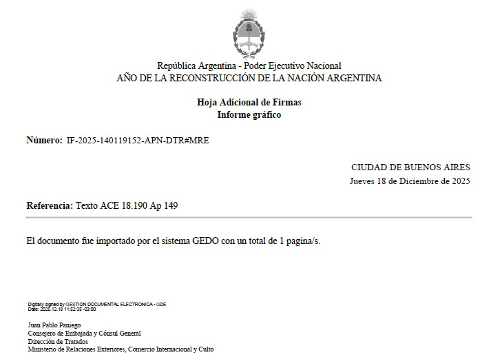 N° 18 (ACE N° 18), de acuerdo a lo dispuesto en el artículo 18 del