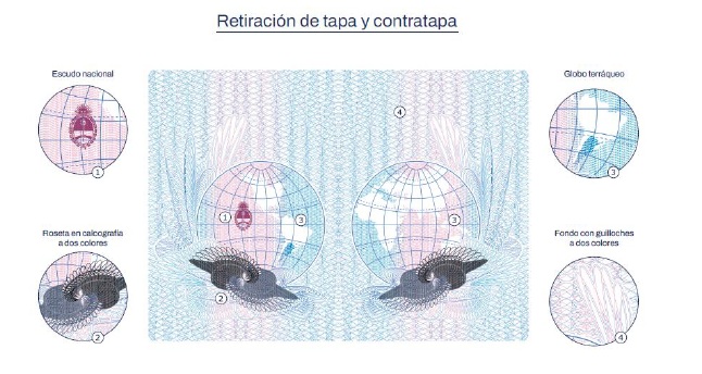 La retiración de la tapa incluye una imagen del escudo nacional y ambas cuentan con una representación del globo terráqueo.