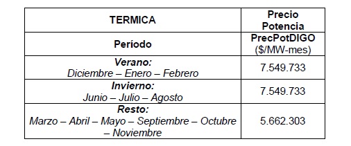 Potencia Garantizada (PrecPotDIGO), expresado en $/MW-mes, para la