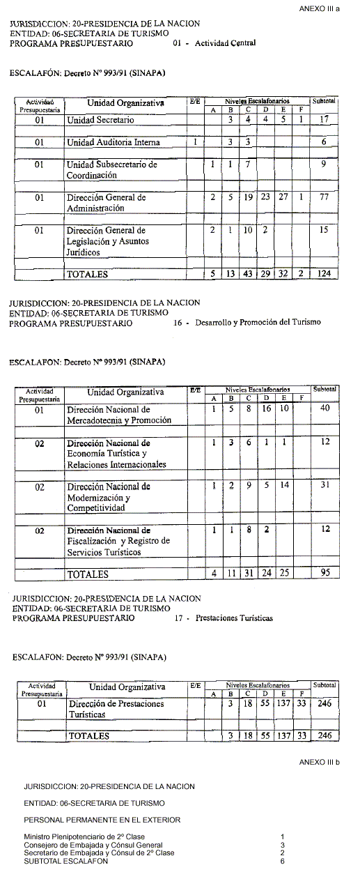 Art. 3º — Apruébase la estructura organizativa de la SECRETARIA DE TURISMO de la PRESIDENCIA DE LA NACION, cuyo Organigrama, Objetivos, Responsabilidad Primaria y Acciones, Planta Permanente, Personal Permanente en el Exterior y Planta No Permanente, como Anexos I, II, IIIa, IIIb y IIIc, respectivamente, forman parte integrante del presente Decreto.
