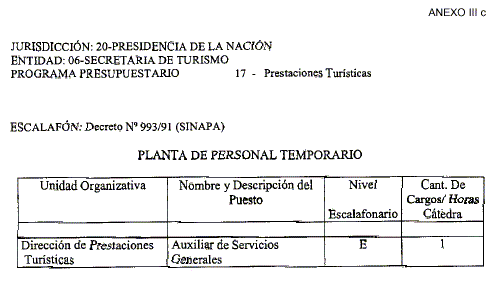 Artículo 1º — Sustitúyese el Anexo I del Decreto Nº 20 del 13 de diciembre de 1999, en la parte correspondiente a la PRESIDENCIA DE LA NACION - SECRETARIA DE TURISMO, por el siguiente texto:
