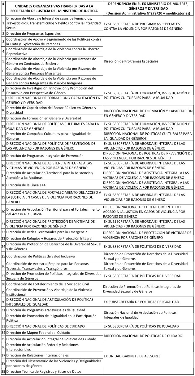 ARTÍCULO 1°.- Transfiérese la SUBSECRETARÍA DE PROTECCIÓN CONTRA LA VIOLENCIA DE GÉNERO del MINISTERIO DE CAPITAL HUMANO al ámbito de la SECRETARÍA DE JUSTICIA del MINISTERIO DE JUSTICIA.